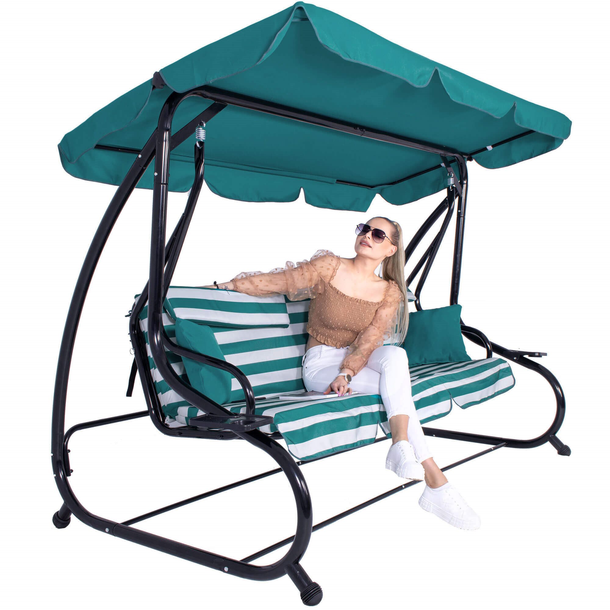 Springos dārza šūpoles ir mēbele, kas nepieciešama katrā dārzā un uz katras terases! Šīs ērtās, salokāmās dārza šūpoles apmierinās pat visprasīgākos lietotājus, kuri vēlas atpūsties ārā. Springos dārza šūpoles rāmis ir izgatavots no izturīga un izturīga tērauda ar pulverkrāsojumu melnā krāsā. Biezās rāmja caurules, kas apvienotas ar izturīgu un izturīgu sēdekļu materiālu, rada īpaši izturīgu struktūru. Springos šūpoles var atlocīt guļus stāvoklī. Komplektā esošie ērtie spilveni ļaus pilnvērtīgi atpūsties svaigā gaisā! Plašais un ērtais šūpoļu sēdeklis var uzņemt līdz pat vairākiem cilvēkiem, tāpēc mēbele var veiksmīgi kalpot kā papildu sēdeklis dārza svētku laikā. Gan dīvāna sēdeklis, gan nojume ir izgatavoti no izturīga un ūdensnecaurlaidīga auduma. Konstrukcija ir izgatavota no biezām un izturīgām tērauda aurulēm, kas pārklātas ar pulvera pārklājumu. Pie tā malām piešūti volāni nodrošina papildu aizsardzību pret sauli, kā arī unikālu viziera rotājumu. Springos dārza šūpoles priekšrocības: Ērts sēdeklis ar spilveniem Ūdensizturīgs materiāls Regulējams vizieris Izvelkams guļus stāvoklī – gulēšanas funkcija Pretslīdošs kāju gals Augsta kravnesība līdz 300 kg! Stabila konstrukcija Universālas, pieklusinātas krāsas Augsts atpūtas komforts 2 sānu galdi Parametri: Zīmols: Springos® Materiāls: tērauds ar pulvera pārklājumu Maksimālā slodze: 300 kg Spilvena krāsa: jūras/balta Rāmja krāsa: melna Rāmja apdare: matēta Izmēri: Kopējais augstums: 162 cm Kopējais platums: 230 cm Pamatnes dziļums: 130 cm Atzveltnes augstums 50 cm Sēdekļa dziļums: 50 cm Dziļums atlocītā stāvoklī: 100 cm Sēdekļa platums ar spilveniem: 186 cm Augstums no grīdas līdz sēdeklim: 40 cm Caurules biezums: 48,3 mm, 32,3 mm, 28,3 mm, 19,5 mm, 16,2 mm Nojumes platums: 222 cm Nojumes dziļums: 117 cm Dzērienu turētāju izmēri: 24 x 14 cm Dzērienu cauruma diametrs: 7 cm Iekļauts: Dārza šūpoles rāmis Spilvenu komplekts rāmim 2 papildu krēmveida spilveni 35 x 35 cm 2 dzērienu turētāji Regulējams vizieris
