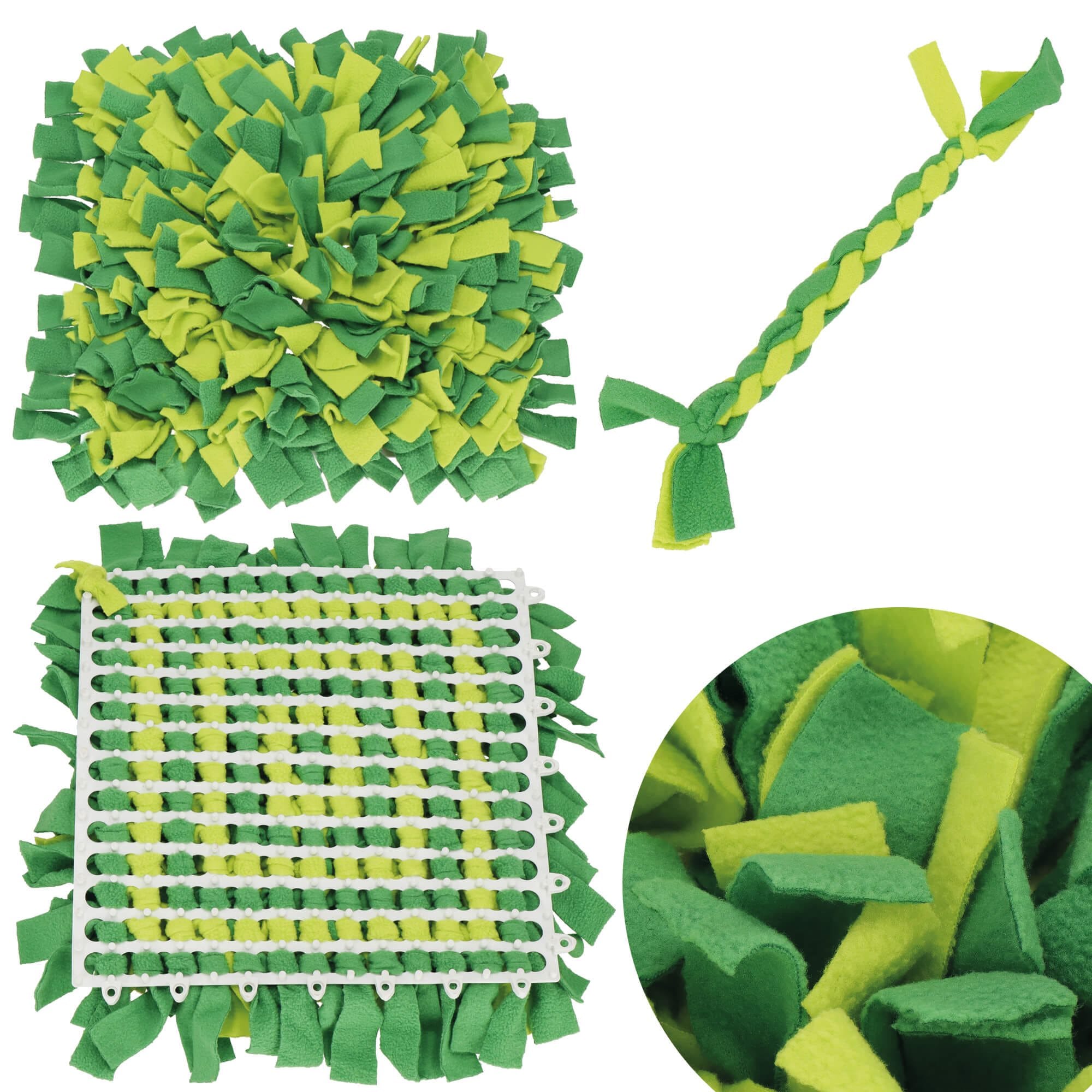 Pamatdati: Zīmols: Springos® Krāsa: zaļi / balti toņi Materiāls: filcs, vilna Tips: suņu paklājiņš + velkonis Izmēri: Pamatnes izmēri: 31 x 31 cm Caurums pamatnē: apm. 1 cm Attālums starp izvirzījumiem pamatnē: apm. 2, 5 cm Kopējais paklājiņa izmērs: 45 x 45 cm Kopējais augstums: apm. 5 cm Pamatnes biezums: 1 mm Paklāja materiāla biezums: 0,5 mm Vilcēja garums: apm. 38 cm Vilcēja biezums: 2,3 mm Papildus informācija: Pamatne aprīkota ar caurumiem, izvirzījumiem un āķiem Iespēja savienot paklājiņus ožas Paklājiņa formu var mainīt, izmantojot izvirzījumus un āķus