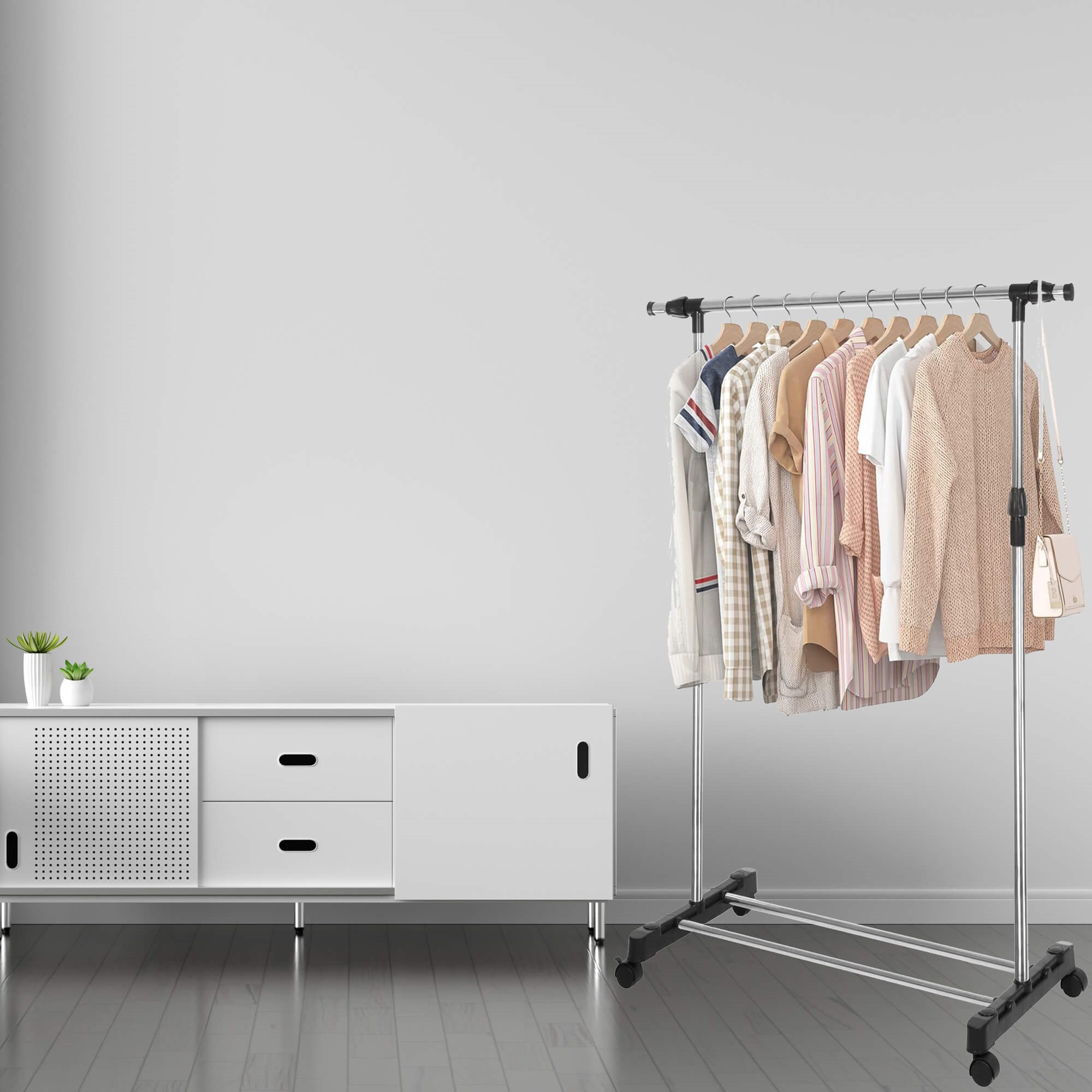 Zīmols: Springos® Materiāls: alumīnijs + plastmasa Krāsa: sudraba + melna Maksimālā slodze: 15 kg (vienmērīgi sadalīts) Pamata riteņu skaits: 4 (bloķējami) Teleskopiskā konstrukcija Piekaramo cauruļu skaits: 1 Cauruļu skaits pie pamatnes: 2 Produkts pašmontēšanai Izmēri: Kopējais augstums: 160 – 94 cm Kopējais garums: 150 – 85 cm Kopējais platums: 45 cm Konstrukcijas cauruļu biezums: 2 / 2,2 / 2,5 cm Attālums starp pamatcaurulēm: 14 cm Attālums starp zemi un pamatnes caurulēm: 7 cm Pamatnes caurules garums: 69 cm Augšējās sijas garums: 68 cm Kopējais augšstilbu garums: 33 cm