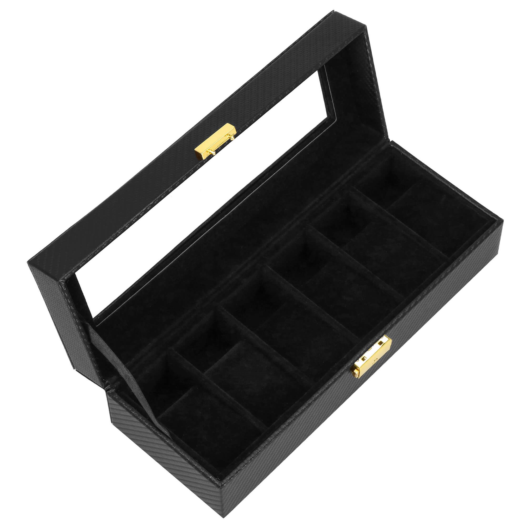 Zīmols: Springos Krāsa: melna Salona krāsa: melna Aparatūras krāsa: zelts Apdare: oglekļa Materiāls: MDF, eko-āda, velūrs Pulksteņu skaits: 6 Līmeņu skaits: 1 Logs: jā p> Salocītas kastes izmēri: 30 x 11 x 8 cm Nodalījumu izmēri: 9,5 x 4,5 cm Spilvena izmēri: 7 x 4 x 3 cm Logu izmēri: 25 x 6 cm