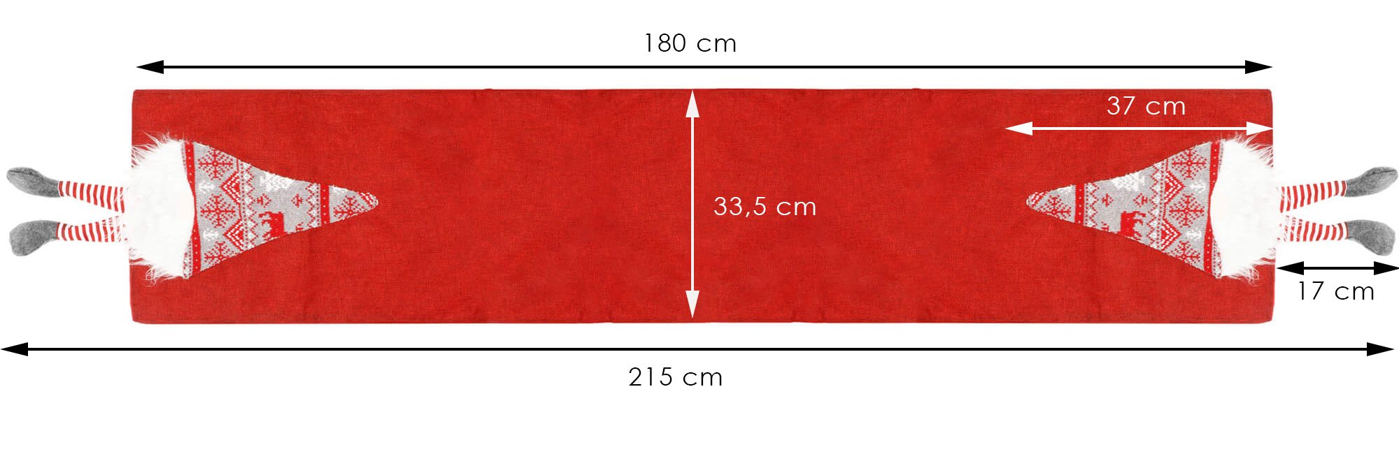 Raksts: sarkans ar elfu ar kājāmMateriāls: filca audumsKrāsa: sarkana, pelēka, balta < /span>Kopējais platums: 33,5 cmKopējais garums: apm. 215 cm< span style=”color: rgb(34, 34, 34); font-family: “Open Sans”, sans-serif; font-size: 16px; background -krāsa: rgb(255, 255, 255);”>Protektora garums (bez kājām): apm. 180 cmKāju garums: apm. 17 cmRūķa garums uz galda celiņa (bez kājām): apm. 37 cm