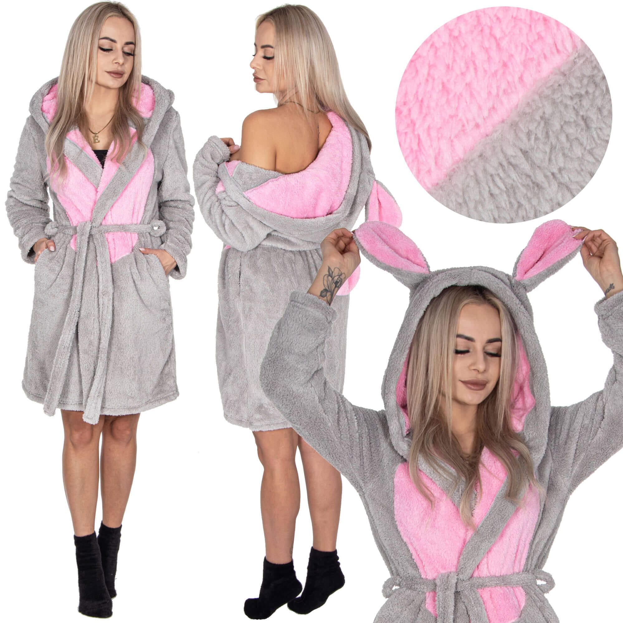 Dāmu halāts no flīsa ar kapuci, izmērs L/XL Springos HA7372, gaiši pelēks ar zaķa ausīm