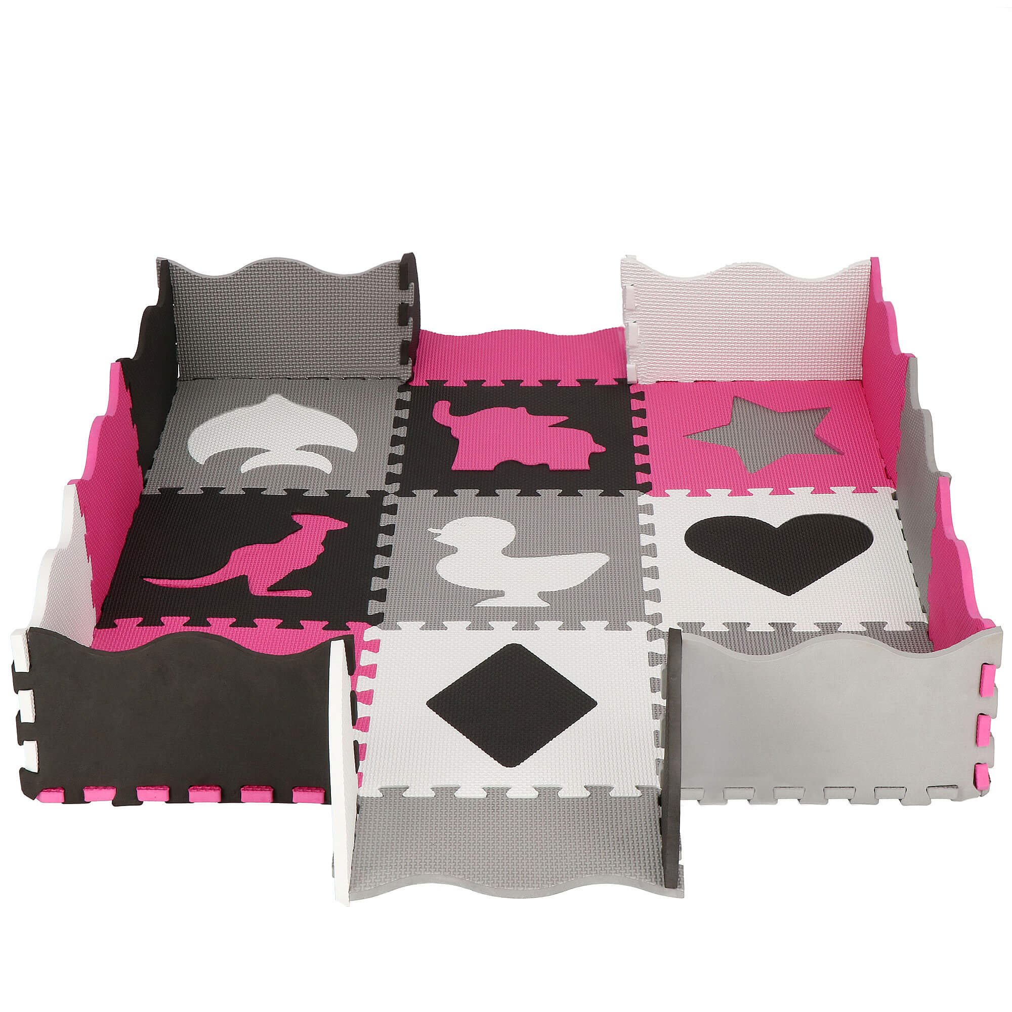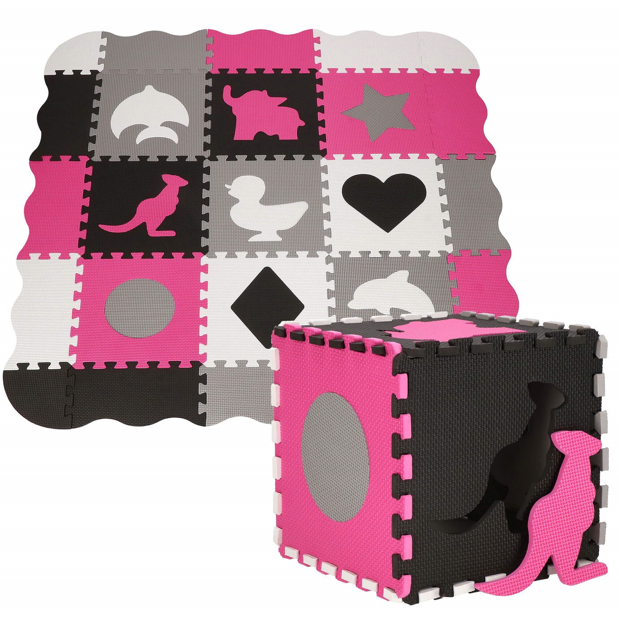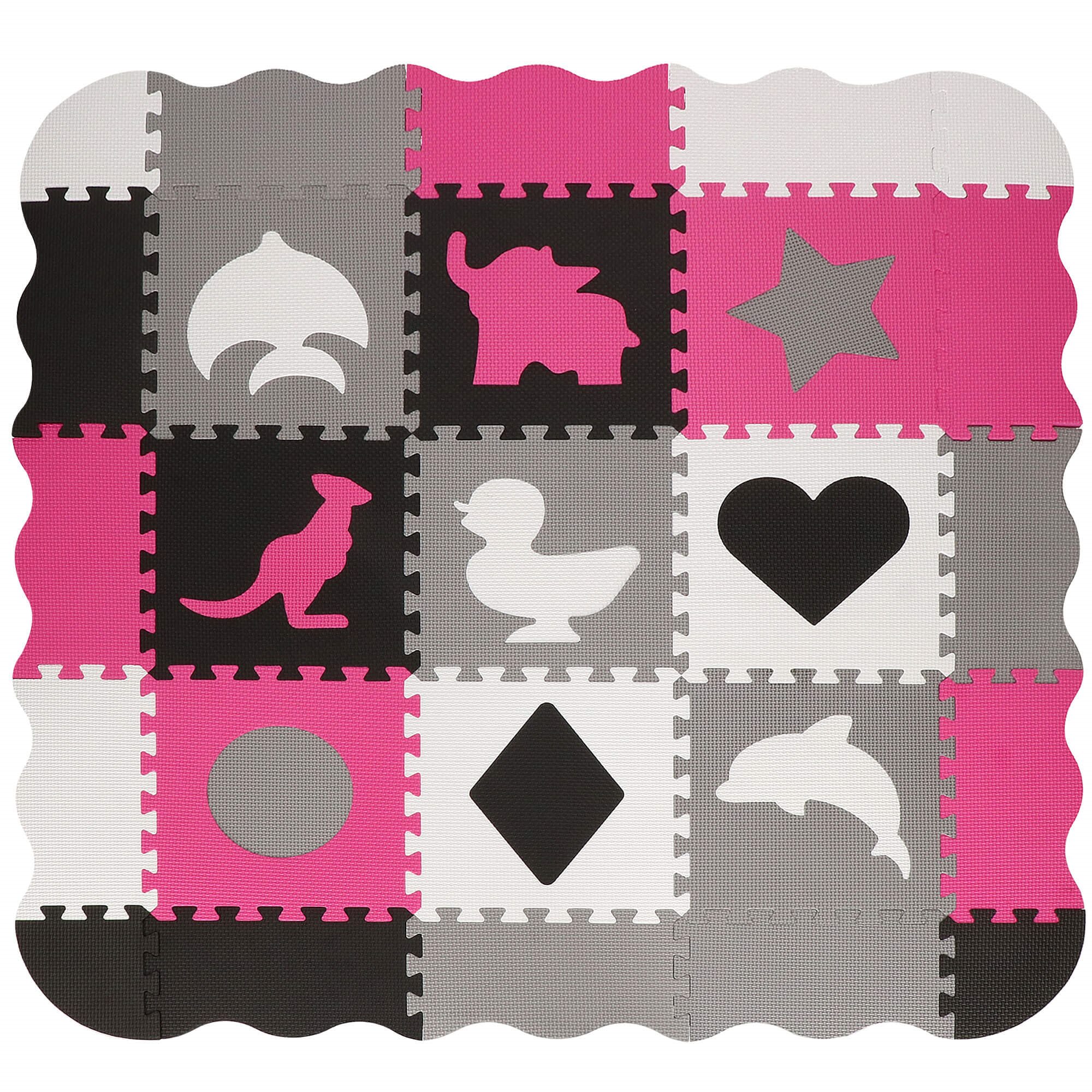 Pupu komplekts bērniem.Materiāls: EVA putasRaksts: formas Krāsa: balta, pelēka, rozā, melns Mīklu skaits: 9 Maliņu skaits: 12+4 mazākas Visu elementu skaits: 34 (puzle, puzles pildījums, malas)Izmērs atlocītā stāvoklī ar plakanām malām: 120×120 cm Puzles izmērs: 30×30 cm Apmales izmērs: 30×15 cm Biezums: 1 cm Apmales var montēt plakaniski un vertikāli Izmērs pēc salocīšanas: 30x30x20 cm Piemērots bērniem no: 10 mēnešu vecuma Iekļauts vāksŪdens izturīgs Nav toksisks Viegli tīrāms Stimulē iztēli Aizsargā, kad spēlēšanās uz grīdas vai zāliena Reljefa virsma neļauj paslīdēt uz paklājiņa